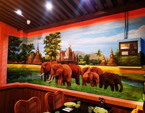 下班后打卡金象湾金榜店,一进餐厅就感受到浓浓的泰国风情,壁画上还有我喜欢的大象。 这次我点了马来咖喱鸡、泰式猪颈肉、冬阴功汤、马来盏通菜和米饭,餐厅上菜速度真的好快,不到十分钟就上齐了所有菜品,总体感觉这边的口味还算能在接受的范围,不会太辣。