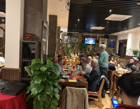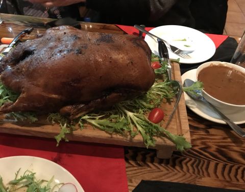 儿子同学聚会选择的地方,高大上的,一群小伙子,吃的倒是也不错,肉啊什么的,比较对胃口。 儿子是一从来不吃蔬菜的人,一盘儿沙拉居然搞定了。 运气也比较好,虽然没有提前预定,还有一只圣诞烤鸭,大快朵颐...