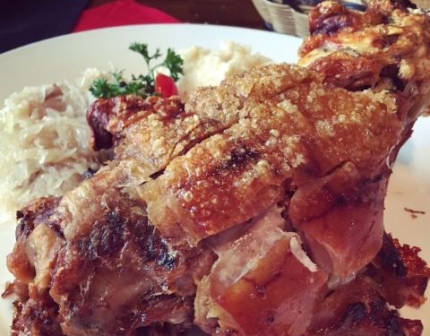 烤肘子,里边儿是土豆泥和酸菜,这些是多经典的东北菜搭配啊。德国菜就是欧版的东北菜,分量惊人