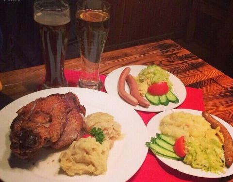 菜品不错,推荐烤猪肘和德式烤肠,还有黑啤。服务周到,晚间的表演也不错,价格有些小贵,不过十分具有德国特色,值得一去。 - 烤肘子,里边儿是土豆泥和酸菜,这些是多经典的东北菜搭配啊。德国菜就是欧版的东北菜,分量惊人