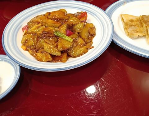 坐的地可能是门口,风哪个冷,只能凑合了。团购了两个菜,一个宫保鸡丁一个红烧茄子,还挺实惠的,鸡丁有点辣,味道也还可以吧。