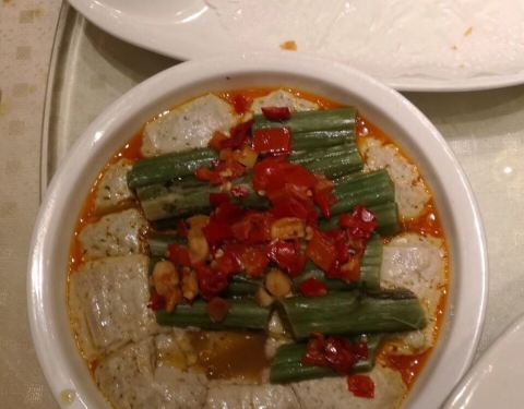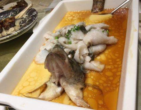 推荐鲫鱼豆花这个菜,鱼肉切片,下面应该是豆腐,不过现在已经是蛋羹了,但是味道好吃,鱼肉被上浆...