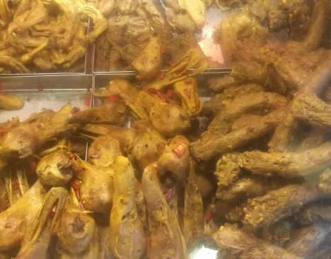 来成都都江堰必吃兔头,玩了一周时间着实有点累了,买点都江堰名小吃回酒店吃吃吧。这家店在江安路上,其实在我的酒店附近也有一家的,在点评网上人气指数高些就来这家了,店铺里布局比较挤,到时他们正好在备货上货,时间还早没有抄菜,买了点兔头五香的与麻辣味的,嫩嫩的,兔舌头,兔脑都好喜欢,还买了串串,冻豆花,非常喜欢,鸡爪,有吃头。