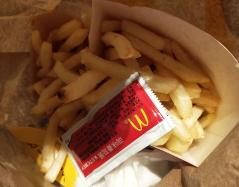 - 炸薯饼,土豆裹着面糊,一片比较薄,刚出锅的很好吃。麦当劳的装修,整体都是整洁,干净,明亮的