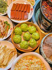 - ...头锅盛上来的,蘸碟是自助的形式,可以依据个人的口味调制,还有冰粉,口感很好,还有各种蔬菜和水果