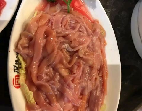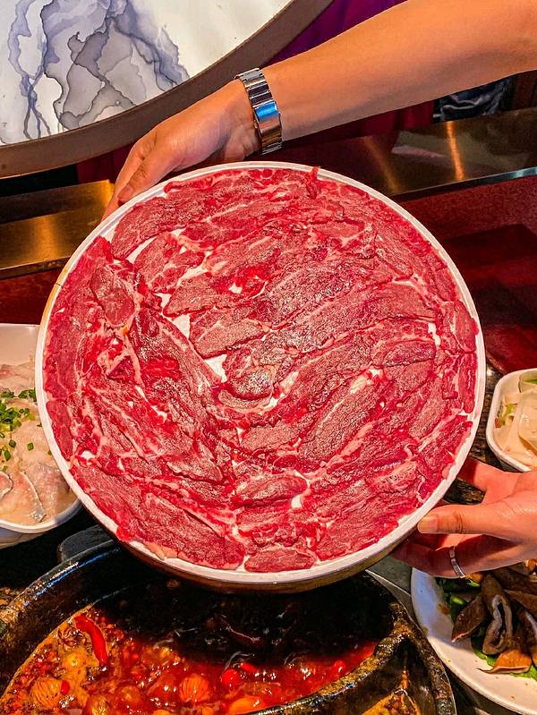 ✔️手切鲜牛肉 这个牛肉的品质真的很不错哦!牛肉色泽红润纹理清晰,立盘不倒,涮至变色就可以享用了,好吃
