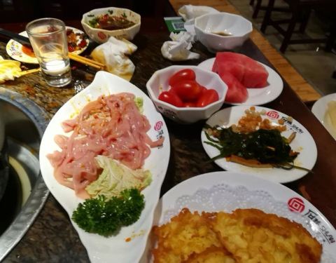 ...头锅盛上来的,蘸碟是自助的形式,可以依据个人的口味调制,还有冰粉,口感很好,还有各种蔬菜和水果