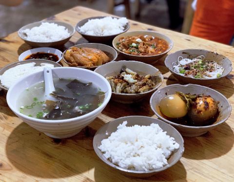 菜都是用同一个规格的土碗来盛,荤素都差不多5元,特别地实惠。海带排骨汤是众人首推,味道特别地浓厚,海带鲜美,让人倍感满足。凉拌类,耳丝、茄子、豇豆等等都值得一试,尤其是茄子,佐料拌得特别地入味。烧菜类,黄豆烧肥肠,黄豆耙,肥肠糯,不得不说厨师手艺好,在保证嚼得烂的同时也兼顾了有韧劲的口感。豆花的话也很嫩,配上老板精心调制的佐料,特别适合配着饭吃。