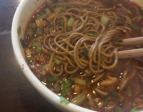 中午办事比较晚,快两点想在附近找个吃的,提议吃荞面老弟欣然同意。老弟说吃点粗粮对身体好,然后把车停在附近的如家酒店的停车场。 [环境]和前几年一样没有什么变化,但是后面变大了,扩大了好几个房间出来。 [...中午办事比较晚,快两点想在附近找个吃的,提议吃荞面老弟欣然同意。老弟说吃点粗粮对身体好,然后把车停在附近的如家酒店的停车场。 [环境]和前几年一样没有什么变化,但是后面变大了,扩大了好几个房间出来。 [服务]还可以,就是前台先收钱马上开始做,上面快。 牛肉荞面小份12元,里面的芹菜颗粒很多。笋子和牛肉很入味,分量不多。 叶儿粑一咬就飙出很多油,肉不算多,口感还是喜欢的。价格还是有点贵的,荞面都快吃不起了。