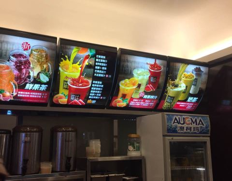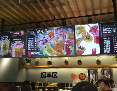 一家门面不大,装饰新潮、连锁经营的知名果汁饮品店,位于成都春熙路商圈内,这里为顾客提供数十款精美饮品