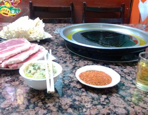 来这的基本都是朋友介绍来的。房子好象是老板自己家的,也没雇服务员,老板亲自服务。人特别热情,不忙的时候。门脸不大,屋里也不大,也就四五张桌子。听说原来这连牌匾都没有。大家一传十,十传百的,说这量大,也是慕名去的,但盘子一上来,真服了。一盘肉足足一斤20块钱。沾着辣酱,包着生菜,蒜片,辣椒和肉,老香了。反正觉得只要不是吃素的,到那去准没错。四个人才吃了85元。对了再提示一下,他家是煎肉!!!