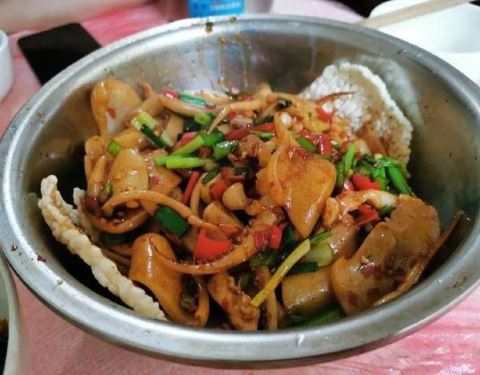 锅巴鱿鱼,这道招牌菜一定要试一试,锅巴比鱿鱼更有韵味!鱿鱼用红椒和芹菜翻炒,弹牙又有嚼头,芹菜鲜甜,汤汁入味。锅巴酥脆,蘸了鱿鱼的辣汁后,酥脆中又带着一丝柔韧的筋道