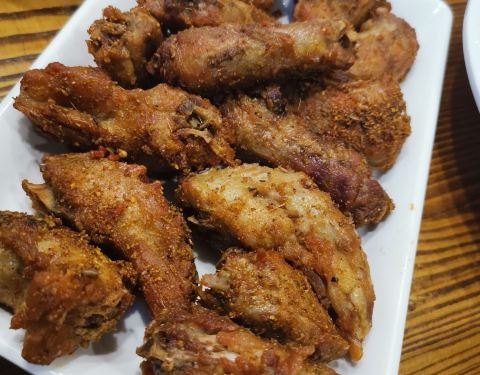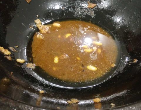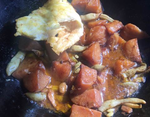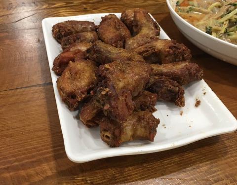 泰来风味馆,主打的东北小吃。 烀饼,首当其冲,一大口锅,饼子在上,下面炖着排骨、芸豆、土豆和宽粉,吃的时候饼和菜配在一起,味道香美,将豆角清洗干净,烧开水将豆角焯一下,去掉豆角的生豆味将肥猪肉放入锅中,待油全部炸出,将油锅中渣滓捞出,将五花肉切成大片,葱姜切大块入锅爆炒,放入十三香、生抽、料酒、盐,将焯好的豆角倒入锅中翻炒,将土豆块倒入锅中,翻炒,待混合均匀,加水,开小火炖,和面,和好后醒一会儿,将面揪成小面团,擀成饼,两面抹些油将几个小饼摞到一起干成大饼,将擀好的饼放入锅里,盖在菜上炖。 孜然鸡