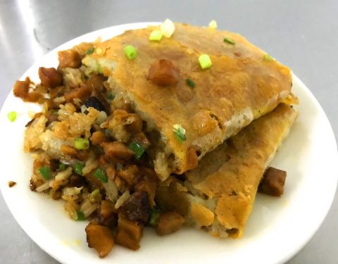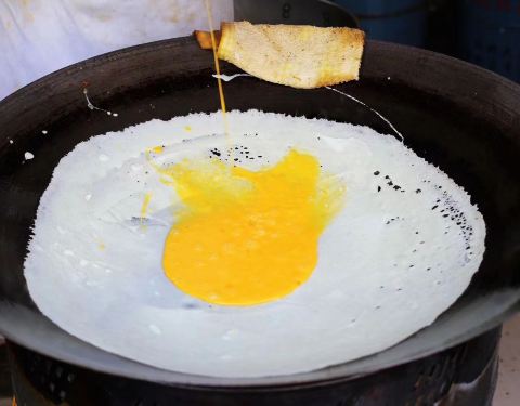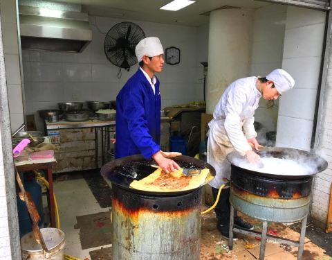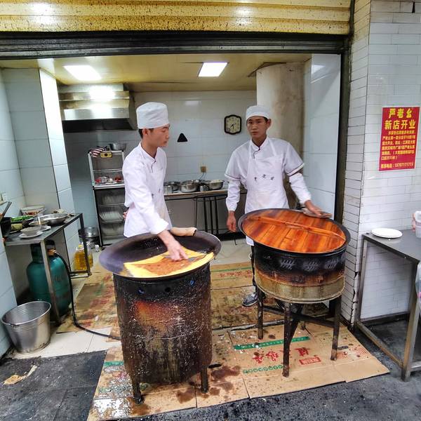 - 现做的豆皮,热热的,油油的,好吃。问了武汉的朋友,推荐了这家严老幺。店面比较老旧,很多人排队
