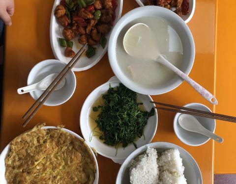 终于蹭到了网红医院食堂啊,感谢王同学的款待,说最好吃的是酒酿带鱼,可惜我不吃鱼,叫了辣子鸡,鸡都很嫩,好评!咕咾肉,像家里烧的,冬瓜鲜肉汤汤白味鲜但不口渴。