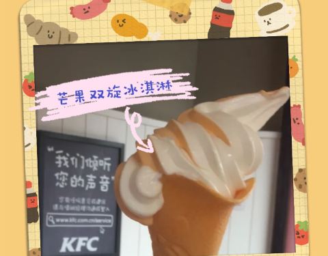 🌈芒果双旋冰淇淋 [爱心]外观: 这款芒果双旋冰激凌也是肯德基限时推出的甜品。芒果的黄色和香草的白色拼接在一起相当有食欲。 🧡口味: 淋芒果酱不同,这种直接拌入芒果粉的冰激凌更入味,和原味香草搭配在一...
