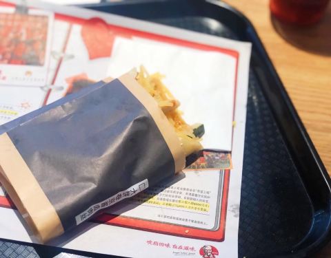 早上路过来吃早饭的。 肯德基大饼卷万物的广告做得很吸引人的,实物确实证明了广告仅供参考。 感觉上就是另一个版本的煎饼果子,里面还是卷了土豆丝,其实也像东北的土豆卷饼。 蛋挞倒是一如既往的老味道,酥脆喷...早上路过来吃早饭的。 肯德基大饼卷万物的广告做得很吸引人的,实物确实证明了广告仅供参考。 感觉上就是另一个版本的煎饼果子,里面还是卷了土豆丝,其实也像东北的土豆卷饼。 蛋挞倒是一如既往的老味道,酥脆喷香,价格也划算。