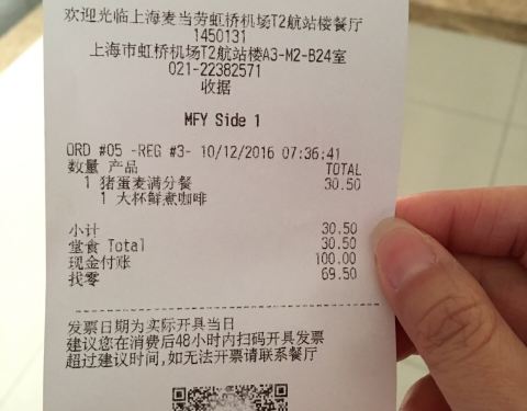 出差,候机,就来吃个麦当劳填填肚子。索要发票,回去要报账,结果说现在店里不提供发票了,请自行手机扫描小票上的二维码,然后自己打印出来就是正规发票。现在这么先进了哟,不过我觉得挺麻烦的呢