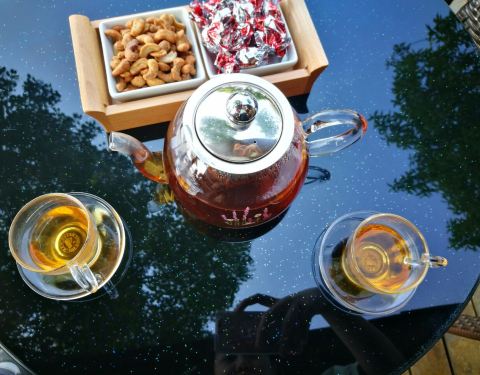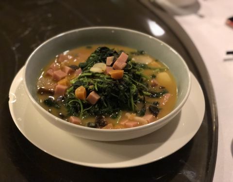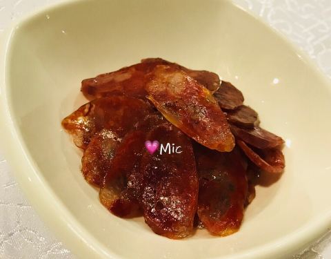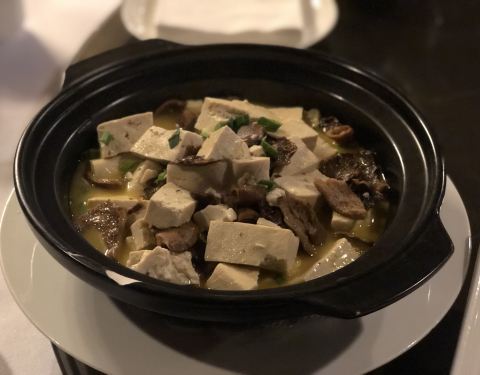 在涵田休息,下午泡了温泉后体力不支,不打算出去了,于是晚饭就选在酒店的中餐厅解决。餐厅需要加收15[%]的服务费,送壶茶,还送了个点心(菱角),熟的菱角粉粉的。 醉虾,酒的味道过浓,因为我平时不喝酒,吃了一个觉得接受不了就没再吃了。 蚌肉豆腐,汤里有黄辣椒,是微微带辣和带酸的。下面还有鸡毛菜。老豆腐带有豆腥气,就是喜欢这个味。 鱼头辽参煲,两份起点,每份半个鱼头半个辽参,也是带有微微辣,有胶原蛋白,还挺好吃的,就是价格不便宜。