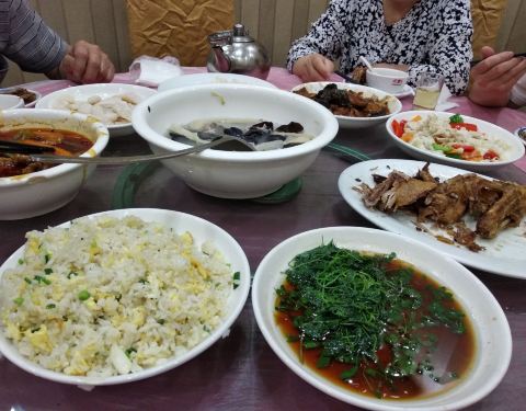 技校里吃饭,what? 没有听错,确实要去技校的食堂。特地没吃早餐起了个晚,check out之后步行过来,种种不就是为了多吃一点,想着自己可能成为第一个客人,其实没有啦,10点半开门营业,已经有好几对咯。环境,怎么形容,有种国营餐厅的感觉,但是配置就是很一般的那种,比食堂稍微好一丢丢。紫红的台布一摊,上面在铺了一层塑料一次性台布,这种感觉就,好吧。看菜单吃饭。 【清溜虾仁】剥壳的河虾仁,个头均匀,倒也色泽油润,吃起来还算弹牙但是新鲜度一般,蘸点醋好一点。 【酱方】量有点大,也不成方,都是起开的,有点走油肉的赶脚。汤汁偏甜,吃了2块饱腹感递增。 【香酥鸭】整只鸭子上桌,切分的,带头部有点不明觉厉。酥酥的外皮,吃掉腿之后鸭身基本浪费了。 【蹄筋】小伙伴点的,不过我对于蹄筋类一直不感冒,因为都是发出来的那种东西,吃起来口感并不怎样。 【水芹香干】就想吃点绿叶菜,水芹吃起来比西芹带感,脆脆的,其实更喜欢吃纯水芹,再嫩一点更好。 【咸肉冬瓜汤】很大一缸子,里面冬瓜和咸肉都有,量比较实诚。米饭+1元人均挺吃。 性价比较高,适合4人及以上来吃基于这个菜量。不会注重摆盘,因为很多盘子都有缺口还继续用,要理解,因为是食堂。付费方式可以支付宝或者微信倒也与时俱进~