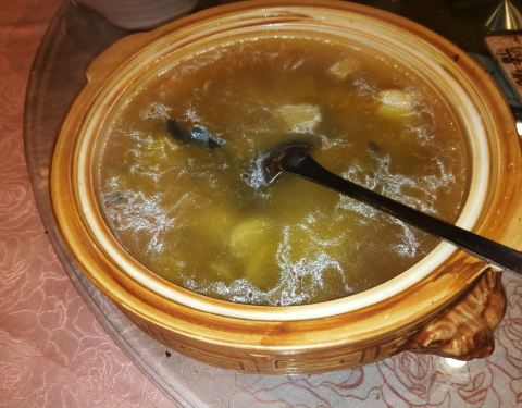 - 酒酿圆子超大一盆,还有虾仁很新鲜很Q嫩,雪花排条做得入味,还有这边的桑嫩芽,上汤里虾仁和皮蛋都很多