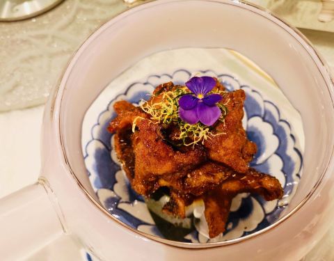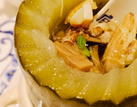 - 「海皇迷你冬瓜盅」,翠绿的夜兰花浮萍其上,正宗的冬瓜盅都会撒上这种小花,去浊添香而又不会抢味
