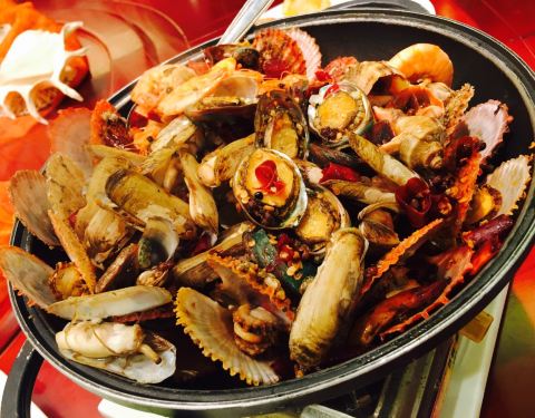 青岛啤酒各位领导请客,啤酒围成一圈,海鲜又是一桌,还有知鸟吃,海胆特别大