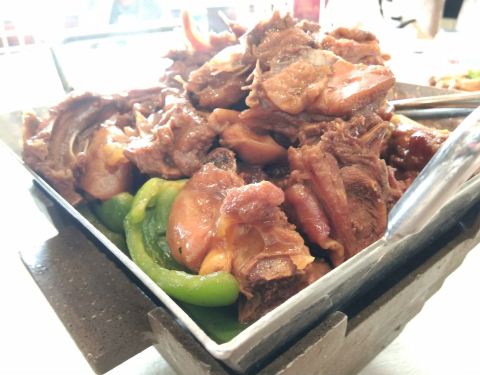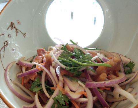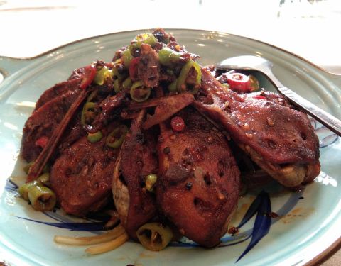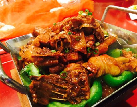 1 圆葱脂渣,脂渣是青岛特色之一,可以炖,可以直接吃,可以凉拌,酥脆香,满嘴油。 2-3 红烧崂山大公鸡,大份实惠,入味,里面的青椒有了滋味基本都被秒光。 4 干锅鸭头,喜欢啃啃的友友自然很爱,我舅妈和小...