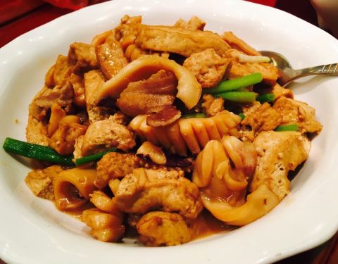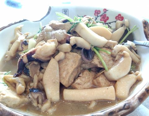 1 圆葱脂渣,脂渣是青岛特色之一,可以炖,可以直接吃,可以凉拌,酥脆香,满嘴油。 2-3 红烧崂山大公鸡,大份实惠,入味,里面的青椒有了滋味基本都被秒光。 4 干锅鸭头,喜欢啃啃的友友自然很爱,我舅妈和小弟媳也爱,包括我^3^ 5 沙子口扇贝柱烧海水豆腐,扇贝柱很大个,它的鲜气也分给了鸡蛋,并没有鸡腥味儿 6 本地小乌鱼烧海水豆腐,海水豆腐可是俺的最爱,有材火大锅的味道。 7 其他菜品木拍,知道人多拍照各种不方便,好在味道都不错。 环境,老饭店,格局有些陈旧,好在味道不错可以弥补,包间大,特别适合家庭聚会。服务一般般啦!收着服务费,一个服务员忙活,我们还要出去到处找她,哈哈。