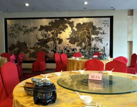 鹿鸣酒家的房间的景观很不错,环境很优美,可以直接看到湖,整个餐厅干净整洁,舒适。蒜蓉蒸丝瓜,丝瓜味道比较清淡,蒜蓉比较够味的。客家豆腐,肉比较少,有点五香粉的味道,豆腐比较嫩滑。客家碌鹅,味道一般,过得去。市师鸡,有两种蘸料,一种是带蚬肉,比较咸,一种是姜葱,鸡的肉质有点软,味道过得去吧。点心方面,榴莲酥,粉质多,榴莲少,味道一般了。法式餐包,是翻叮的,不是即烤的,所以不松化。牛肉球、凤爪之类的就是相对一般的水平。总体而言,环境面湖而建,所以如果坐在临湖区,视野比较开阔的,服务方面,等待的时间比较长,不过服务还是好的,效率有待提高。