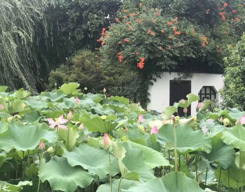 饭后散步找到了这个地方 荷花池里的荷花也正绽放 美丽芬芳 湖里的鲤鱼 给他们一个个喂食 所有的鲤鱼都集中到了一起金红的一片