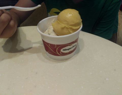 团的哈根达斯的代金券快过期了,而且夏天也已经快到结束的尾巴了,所以带着小家伙玩了汤姆熊,吃完吉旺的晚餐后来到了他们家拔草,点了曲奇和芒果的双球,再点了个芒果的蛋筒,自付2元,店里面除了冰激凌以外,还...团的哈根达斯的代金券快过期了,而且夏天也已经快到结束的尾巴了,所以带着小家伙玩了汤姆熊,吃完吉旺的晚餐后来到了他们家拔草,点了曲奇和芒果的双球,再点了个芒果的蛋筒,自付2元,店里面除了冰激凌以外,还有冰激凌饮料以及蛋糕,可供大家选择。他们家的冰激凌口感比较细腻,也不会特别甜,非常不错,堂吃的话可以坐店外的开放式区域,也可以做店堂内,不过有个小小的建议给商家,麻烦看一下店堂内的座椅,好多座椅的表皮都已开裂,如果皮质座椅比较容易开裂,而且替换成本较高,建议换成木质或塑料座椅,否则比较影响品牌效应。