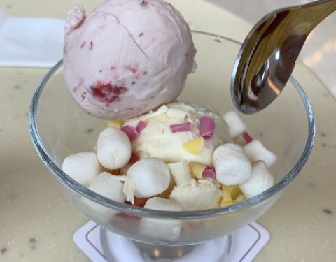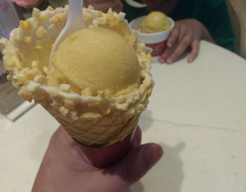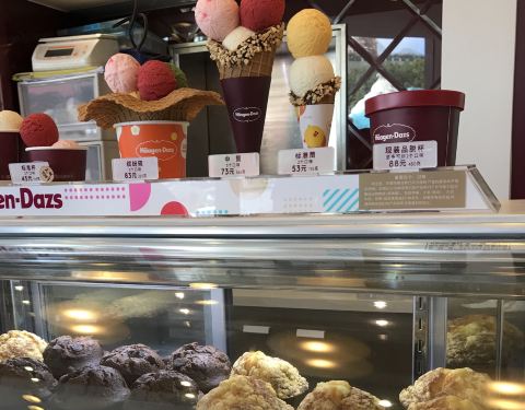 团的哈根达斯的代金券快过期了,而且夏天也已经快到结束的尾巴了,所以带着小家伙玩了汤姆熊,吃完吉旺的晚餐后来到了他们家拔草,点了曲奇和芒果的双球,再点了个芒果的蛋筒,自付2元,店里面除了冰激凌以外,还有冰激凌饮料以及蛋糕,可供大家选择。他们家的冰激凌口感比较细腻,也不会特别甜,非常不错,堂吃的话可以坐店外的开放式区域,也可以做店堂内,不过有个小小的建议给商家,麻烦看一下店堂内的座椅,好多座椅的表皮都已开裂,如果皮质座椅比较容易开裂,而且替换成本较高,建议换成木质或塑料座椅,否则比较影响品牌效应。