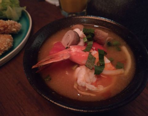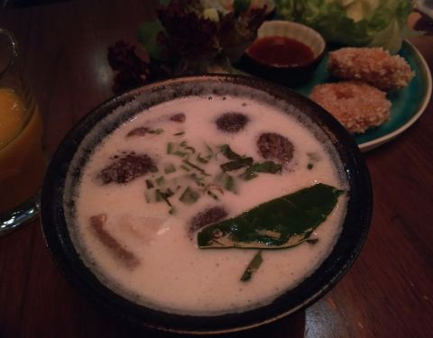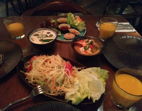 米泰,纠结了很久的一家店。到的比较早,人还不是很多。海鲜汤和椰香鸡肉汤味道浓郁,青木瓜色拉和想像中的有点不一样,不是很吃得惯,虾酱空心菜忘记很服务员说不要蒜了。咖喱鸡和猪颈肉份量挺足,味道不错。环境挺好,性价比一般。