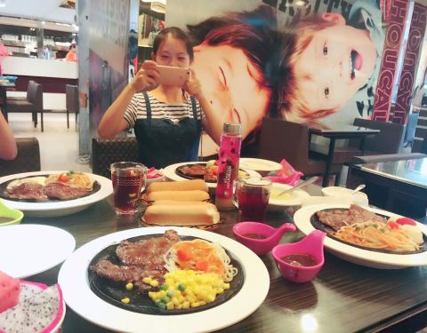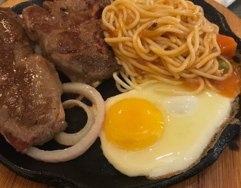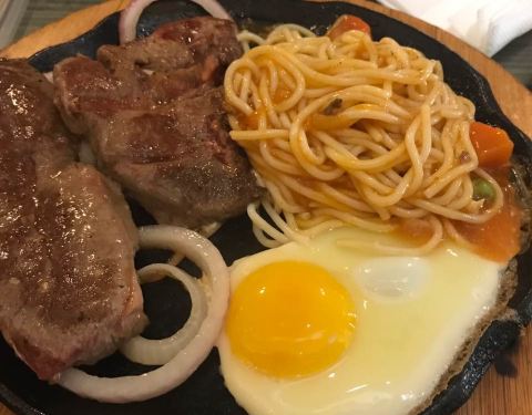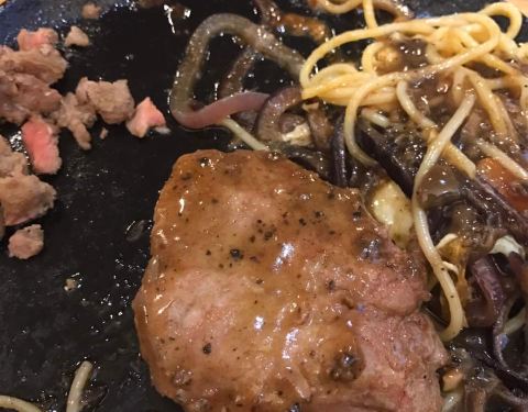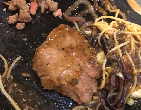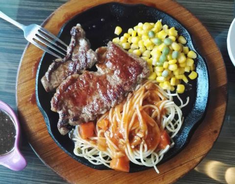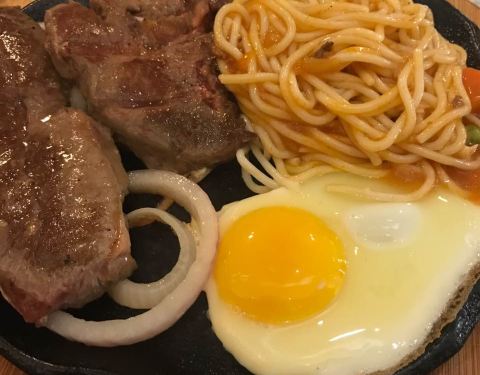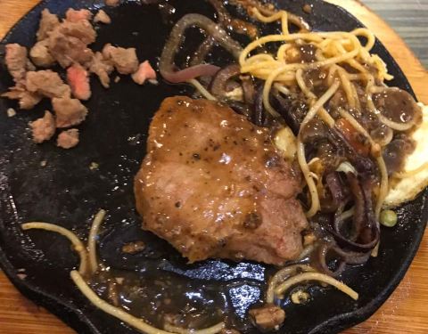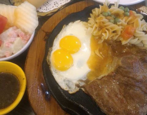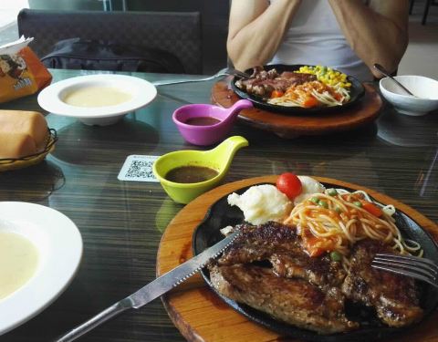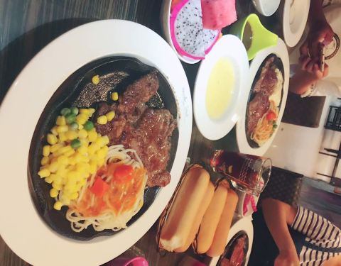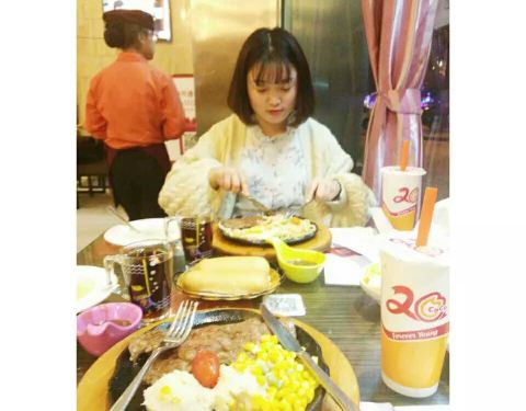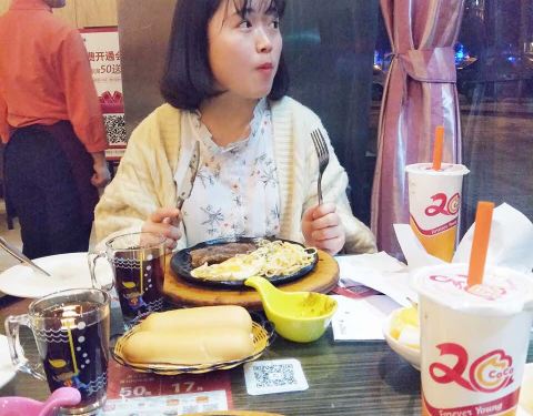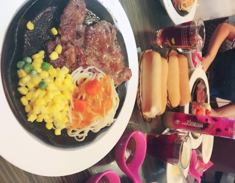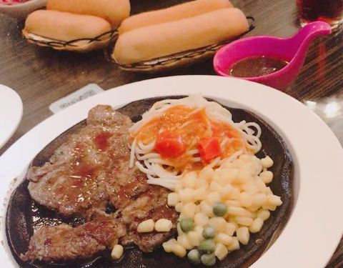 我和我朋友要的牛排是五分熟 吃起来像是全熟一样 可能是因为是铁板的原因吧!这个地方不错 离我们酒店近 因为晚上不想照相 下面的照片是我朋友!推荐我们2人吃的牛排 味道棒棒的(^_^)