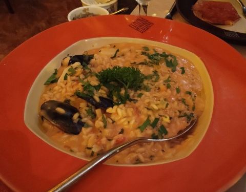 新开的意大利餐厅,意大利海鲜饭很好吃,意大利博饼很好吃,类似于脆饼,特地要了一份意大利火腿,放在博饼上面特别的好吃哦,服务员挺热情。