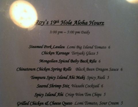 Aloha Hourz (yes, it's spelled that way) is happy hour Mon-Fri 3-5pm: discounted cocktails, beer, wine, and pupu (appetizer) items.