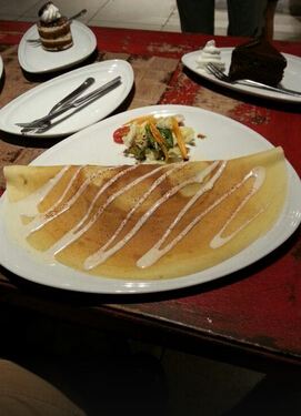 以白色和蓝色的装饰格调让我一进去就喜欢上了,琳琅满目的糕点和甜品让我无法自拔,最后点的巧克力蛋糕和拿铁,巧克力蛋糕非常的好吃,口感也很棒,入口即化,巧克力也不会让我感觉到很腻人,拿铁味道也很香醇,上面的图案也很漂亮我非常的喜欢。 然后就是薄饼了,有没有觉得它很像我们中国北方的“韭菜盒子”啊!(*^__^*) 嘻嘻……虽然有点像,但是口味却是不同的,薄饼里面的馅非常的丰富,而且外面一层脆脆的,口感非常的棒!! 餐厅上菜的速度非常的快,服务人员非常的热情,用餐的环境很舒适。