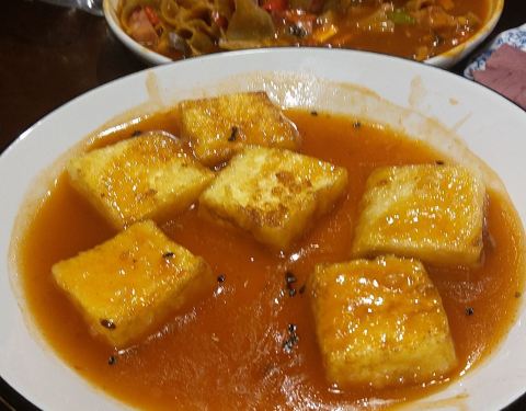 - 一张桌子,四个过去的长木凳,点了烩菜,一品豆腐,凉拌菜,刀削面,都挺好吃的,如果你来了,不如去尝尝啊