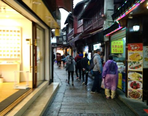 2018年清明节放假第一天,上海在下雨。 雨中的朱家角古镇也是比较热闹的,虽然己经是傍晚时分,可是游客依然络绎不绝地涌向古镇。 古镇里的东井街和西井街是这几年朱家角古镇大量开发出来的。 小吃馆对面就是公共厕所。小笼烧买味道一般,整体小吃馆的东西价格小贵,味道一般,就歺环境恶劣无发票提供。