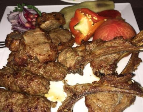 格鲁吉亚餐厅,选择了靠窗户的座位,这样我们就可以在吃饭的时候俯瞰街道,吃了奶油罗宋汤,喀山串土豆、鸡肉烧烤(烤肉串),喝博尔若米水。