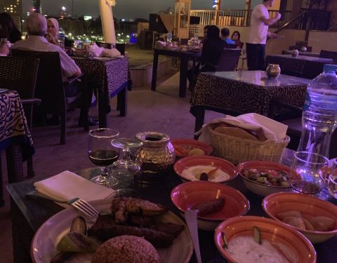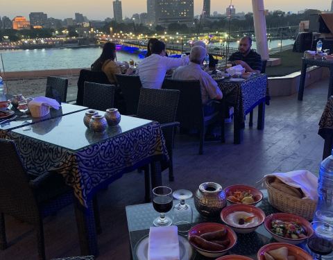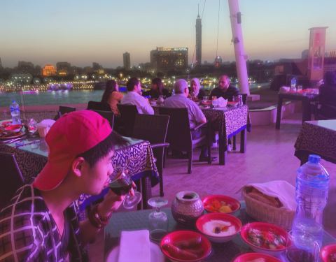 位于洲际酒店室外游泳池旁边的餐厅是我们在开罗吃的最贵的一顿饭了 晚上独有的套餐感觉分量很大 虽然各式各样的肉并不好吃 不过感觉还是很新鲜的 整个店室外的空间直接面向看得到开罗塔的尼罗河 夕阳的时候还是很漂亮的 晚上有些游船点缀在河流上 吹着风喝着酒感觉也不错