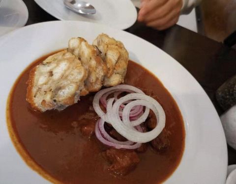布拉格的最后一天去了高堡,参观了圣保罗大教堂和莫扎特和穆夏等人的墓地,这里人少清净又有氛围,静静远眺有种特别的感觉,走完一圈下来在附近找到这家店,环境氛围很不错… 烤肋排:烤的比较软,汁水多,但是量大吃多了很腻 炖牛肉:搭配的面团味道一般像馒头一样,炖牛肉和红烧牛肉的感觉差不多,在欧洲当然要吃肉、肉、肉!捷克有名的就是做肘子,烤的、炖的各有千秋!高堡区的这家是传统老店,一般去的都是当地人,肘子烤的恰到好处,他们家的黑啤也是一大特色!去高堡区游玩的小伙伴可以去品尝一下! 蘑菇汤:比较浓,还不错,里面加了一种绿色的香料味道挺特别可以试试!