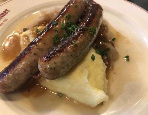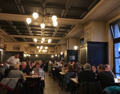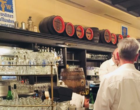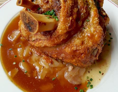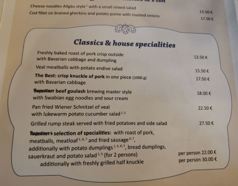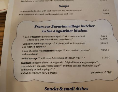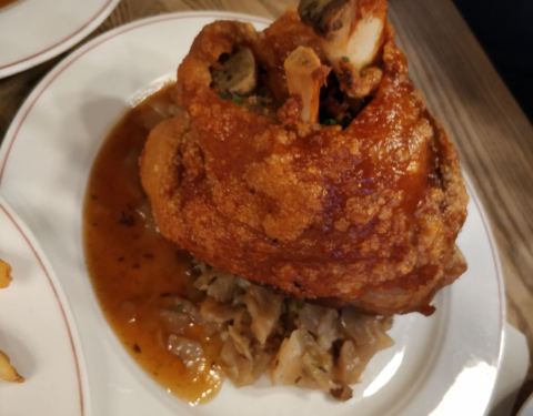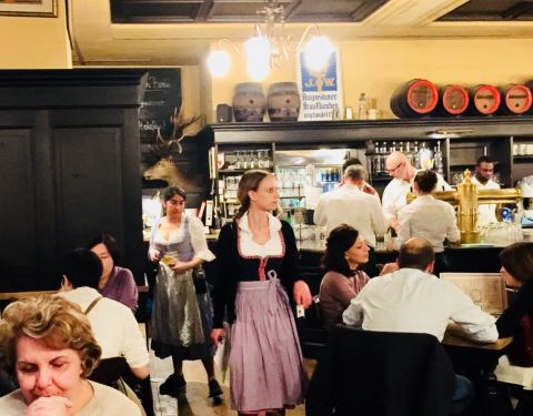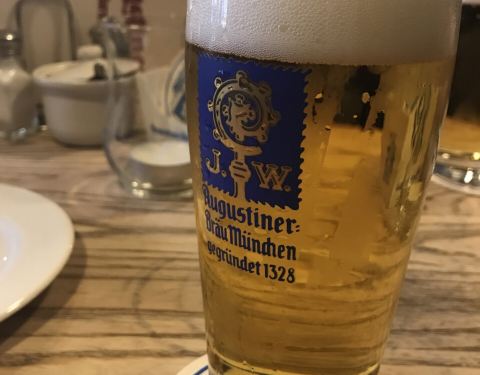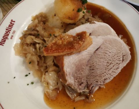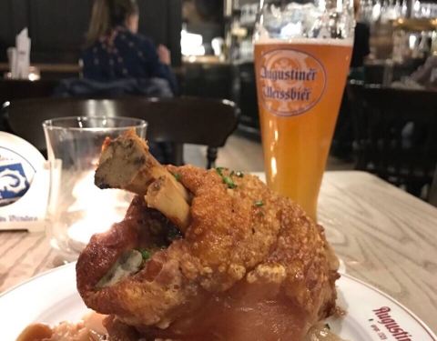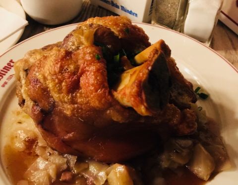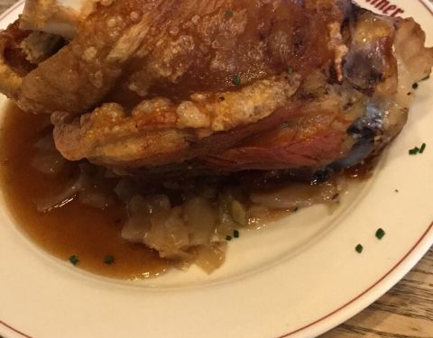 明天即将离开德国,需要再来感受一下烤猪肘子配酸菜的极致美味,依然去了那家比邻老佛爷百货的德餐老字号。 晚上六七点钟正是人们聚餐约会的时候,餐厅排起了长队,虽然它的面积很大,座位很多。 等了大约10分钟,身着巴伐利亚式凸显丰乳肥臀的长裙的姑娘领位我们到餐桌旁,服务周到。 少顷,负责点菜的服务生过来了,餐厅里已经坐满了食客,生意兴隆。菜单上没有图片,还好我们之前拍照过,还要了啤酒和香肠土豆泥,德国特色餐不过如此了。 猪肘一份够两个人吃,脆皮很香但有点儿硬,需要好牙口。酸菜变得格外美味,全被吃光了,皮下的肉炖的比较烂,感觉腻时蘸些芥末酱,味道真的不错。标配的佐餐酒水是啤酒,口味刚刚好。 吃过这餐比较饱腹,估计半个月内再也不想吃肉了。感叹廉颇老矣,尚能饭否。