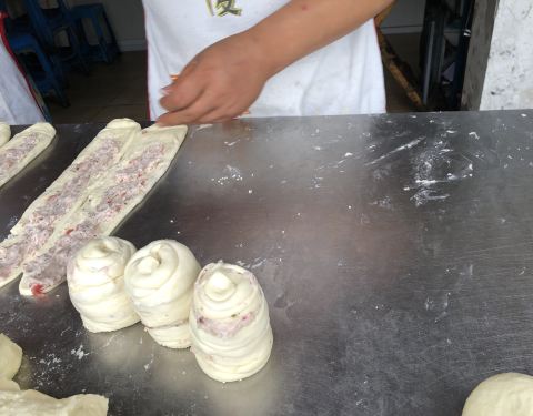 总之有机会去品尝品尝吧!在彭州到军乐镇的入街口处,有两家军屯锅魁店特别引人注目