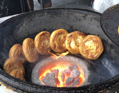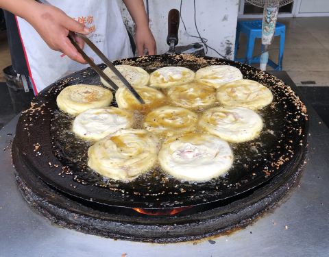 位置就在陈麻婆杜甫草堂店的旁边,去吃陈麻婆豆腐排队等位,看到旁边现烙的锅盔烧饼,买了几个打发时间,没想到味道非常好吃,配上肥肠粉,味道哇哈哈!!