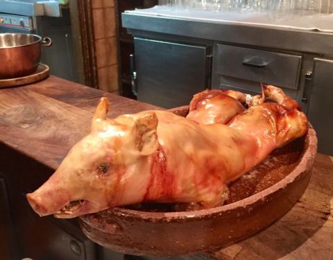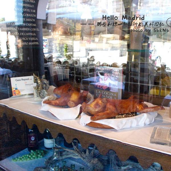 塞戈维亚是烤乳猪的发源地。买车票的时候听一对夫妇聊得口水都要流下来了。桥下的第一家餐厅Candido(坎迪多),一点也不难找,门口有两只小乳猪在招“蹄”~