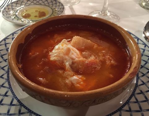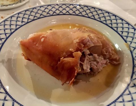 在塞戈维亚著名的大水槽旁有着这家百年老字号,烤乳猪非常有名,据说这个烤乳猪有好几个“三”,乳猪不能超过三公斤,要烤三个小时等等,乳猪皮很薄脆,肉质鲜嫩,只是甜品甜得发腻,没有吃下多少。