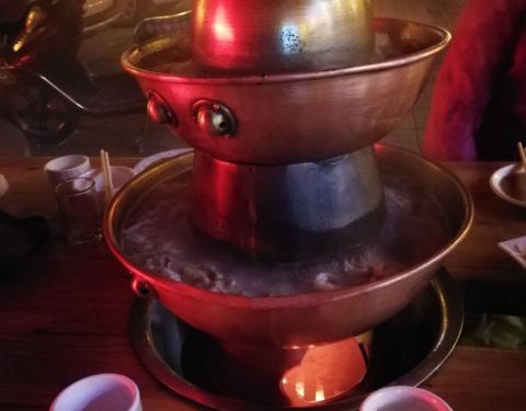 - ...特别有意思的事,鸳鸯火锅是上下层的,和内地的火锅有很大的不同,羔羊肉特别好吃,是特色,一定要点