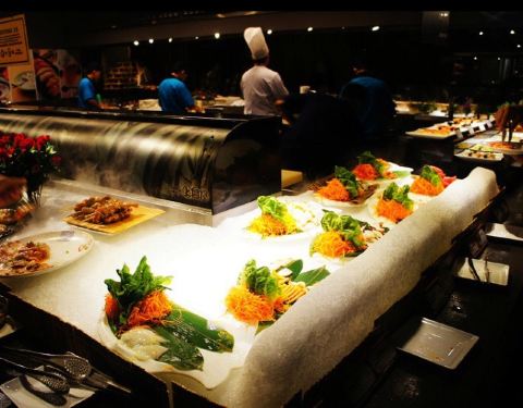 口味不错的,各种鱼生很新鲜不断供。餐厅好大,有日餐、中餐、少量西餐等等。还有免费的冻椰子喝。小龙虾好大只比手还长,只是口味不是麻辣或者十三香的,川菜改良过有点甜,粤菜里的蒸笼类的要现做有点慢,牛展、牛仔骨、虾饺都不错。比国内的很多五星酒店都好很多。灯光有点暗,不太舒服,记住自己的座位,餐厅有点像迷宫。